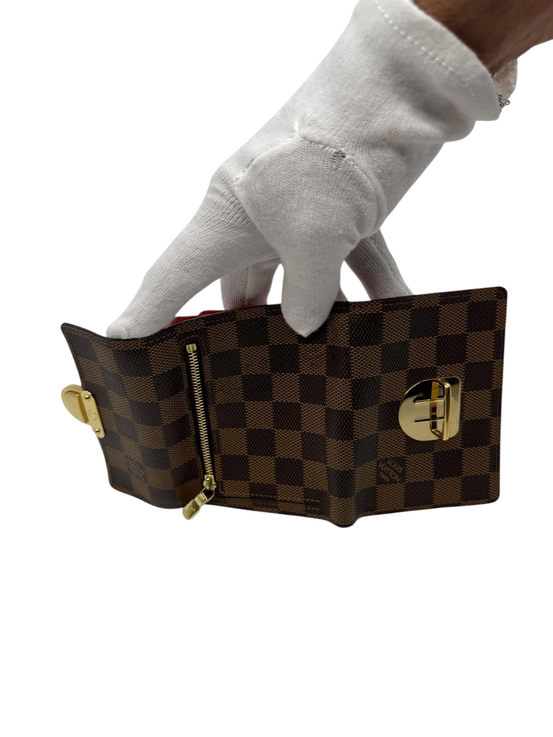 Deze ultrapraktische Louis Vuitton Koala portefeuille – uitgevoerd in het iconische damier ebene en afgewerkt met goudkleurige hardware – is een tijdloos pareltje dat u nog jarenlang zal koesteren.